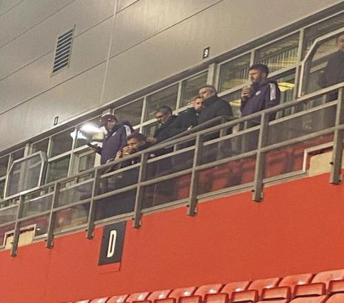 卡里克手捧咖啡,與曼聯(lián)體育總監賈森·威爾考克斯、U18青年隊主教練達倫·弗萊徹以及一線(xiàn)隊教練組史蒂夫·霍蘭德、喬納森·伍德蓋特和喬尼·埃文斯一起出現在看臺上。