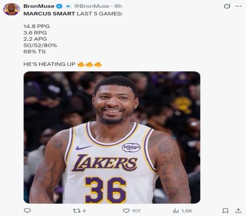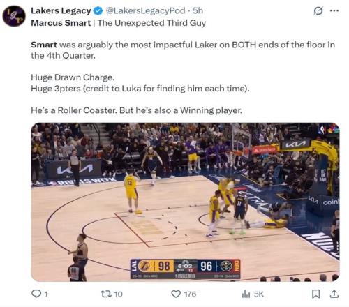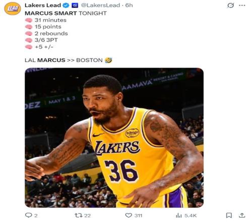 湖人媒體是這樣評價(jià)斯瑪特:斯瑪特是讓人意想不到的第三得分點(diǎn),他在第四節無(wú)疑是湖人攻防兩端最出色的球員,巨大的三分球命中建立巨大的領(lǐng)先優(yōu)勢。
