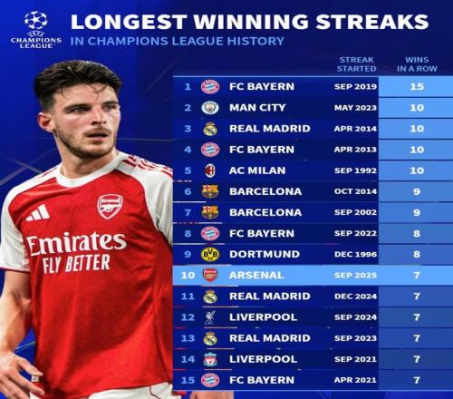 北京時(shí)間1月23日,德轉統計出了歐冠歷史連勝場(chǎng)次TOP10,本賽季聯(lián)賽階段7戰全勝的阿森納并列第10位,拜仁慕尼黑以15連勝排名第一。